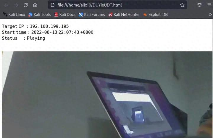 下面是當時實驗時候的監控畫面,我正坐在電腦前,敲打著我的kali上的滲透測試工具,經過一連串復雜的操作,最后當我輸入webcam_stream,被監控的手機攝像頭就自動打開了,而圖片中的Status : Playing 表示這是一個實時監控畫面。
