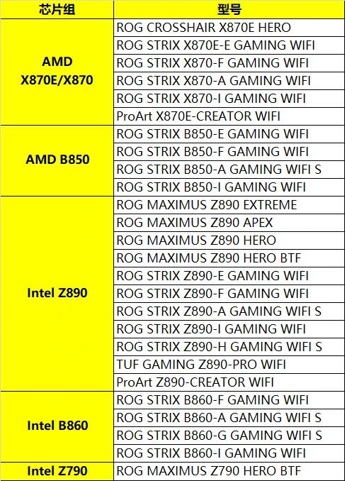 華碩還提供了使用新一代 PCIe Q-Release Slim(顯卡易拆裝)設(shè)計(jì)的主板列表,可以看到型號(hào)集中在英特爾 / AMD 800 系的 ROG、ROG STRIX 產(chǎn)品線上,還包含個(gè)別 TUF、ProArt 款式以及 Z790 后期型號(hào)。