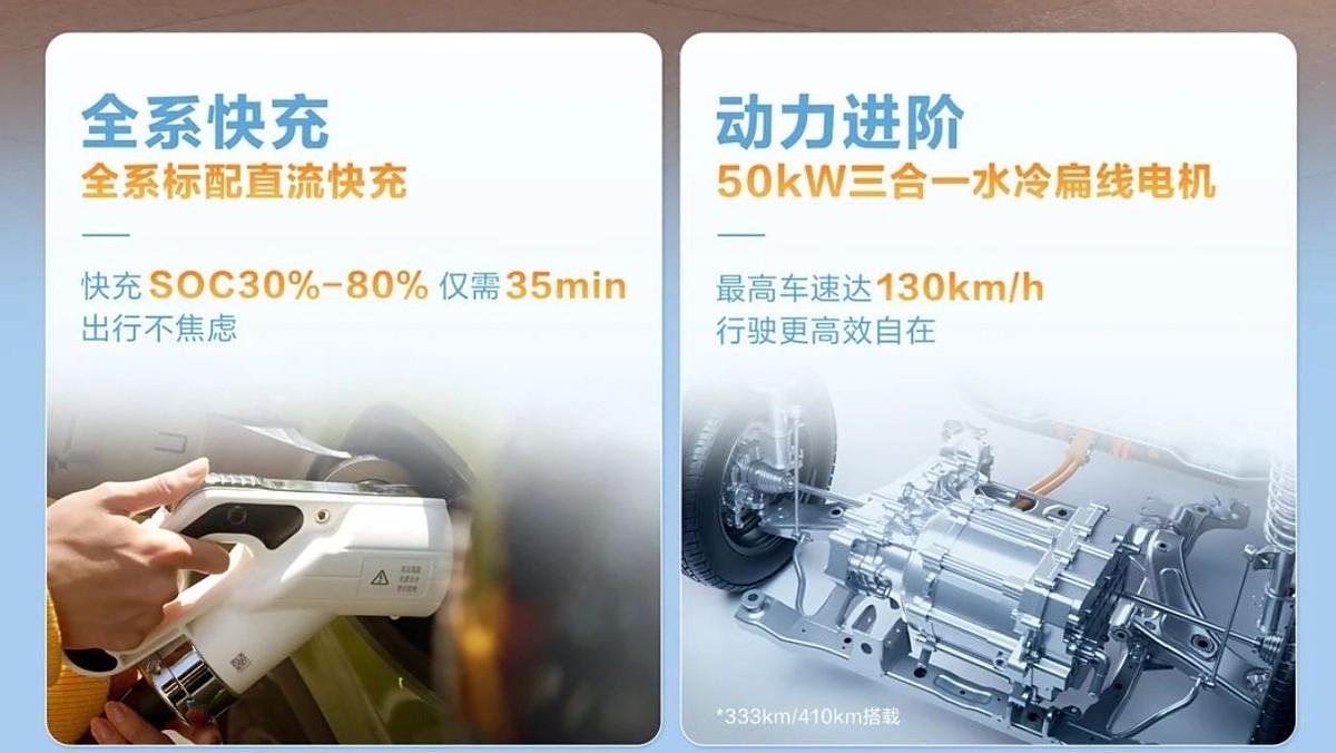 至于在動力系統方面,也是本次改動最大的地方,針對333km和410km的續航版本,則升級了50kW的三合一水冷扁線電機,散熱能力會更強,并且最高速度由原來的120km/h提升至130km/h。