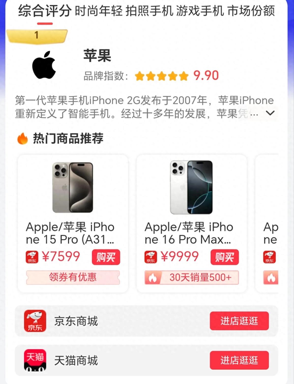 蘋果以 9.90的品牌指數穩居榜首,iPhone系列更是憑借其強大的性能和流暢的系統體驗,俘獲了無數果粉的心。從 2007年第一代iPhone橫空出世,到如今 iPhone 15 Pro的強勢登場,蘋果始終引領著智能手機的發展潮流。7599元起的售價雖然不菲,但依然擋不住消費者的熱情,30天銷量500+的成績就是最好的證明。