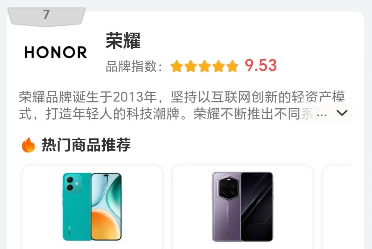 榮耀以 9.53 的品牌指數位列第七,作為華為曾經的子品牌,榮耀始終堅持獨立發展,致力于打造年輕人的科技潮牌。雖然目前榮耀的產品線還不夠豐富,但其未來的發展潛力不容小覷。