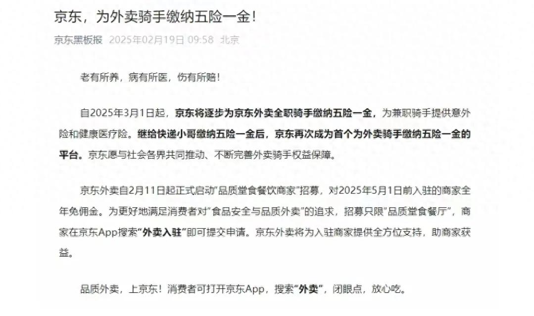 一直以來,外賣騎手這個群體默默為我們的生活提供著便利,他們風里雨里穿梭在大街小巷,可他們的保障問題卻時常被人忽略。然而,京東卻在2025年3月1日起,要逐步為京東外賣全職騎手繳納五險一金,騎手也能有意外險和健康yi liao險啦!這無疑是給騎手們吃了一顆定心丸,讓他們在奔波忙碌的工作中有了堅實的依靠。