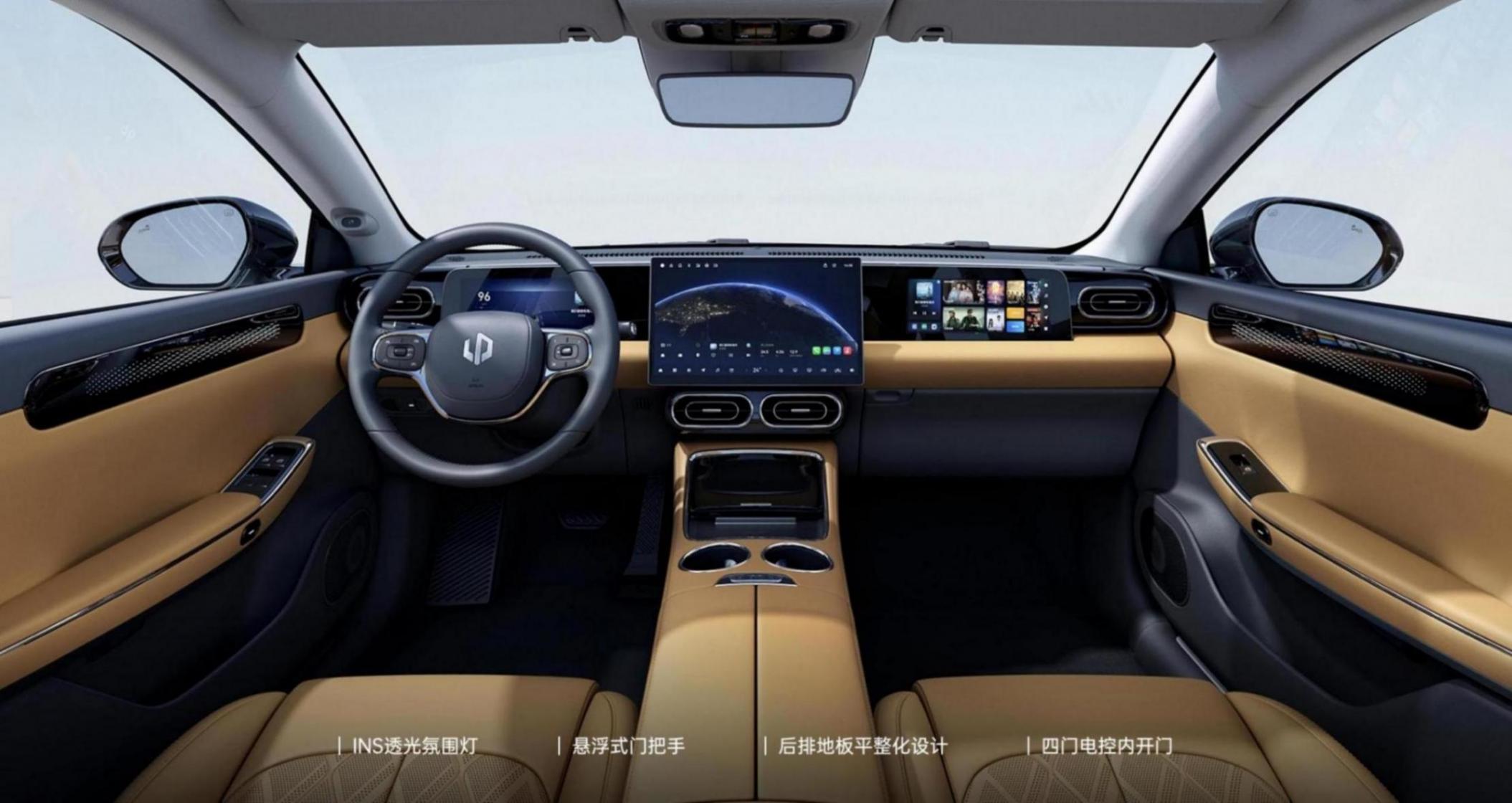 打開車門,零跑 C01 的內飾猶如一個豪華的科技座艙,瞬間將我帶入了一個舒適又充滿未來感的空間。整體布局采用環抱式設計,線條流暢自然,大量軟性材質與皮質的包裹,觸感柔軟細膩,配合精致的縫線工藝,每一處細節都彰顯著豪華品質,手能觸及之處,皆是滿滿的高級感。