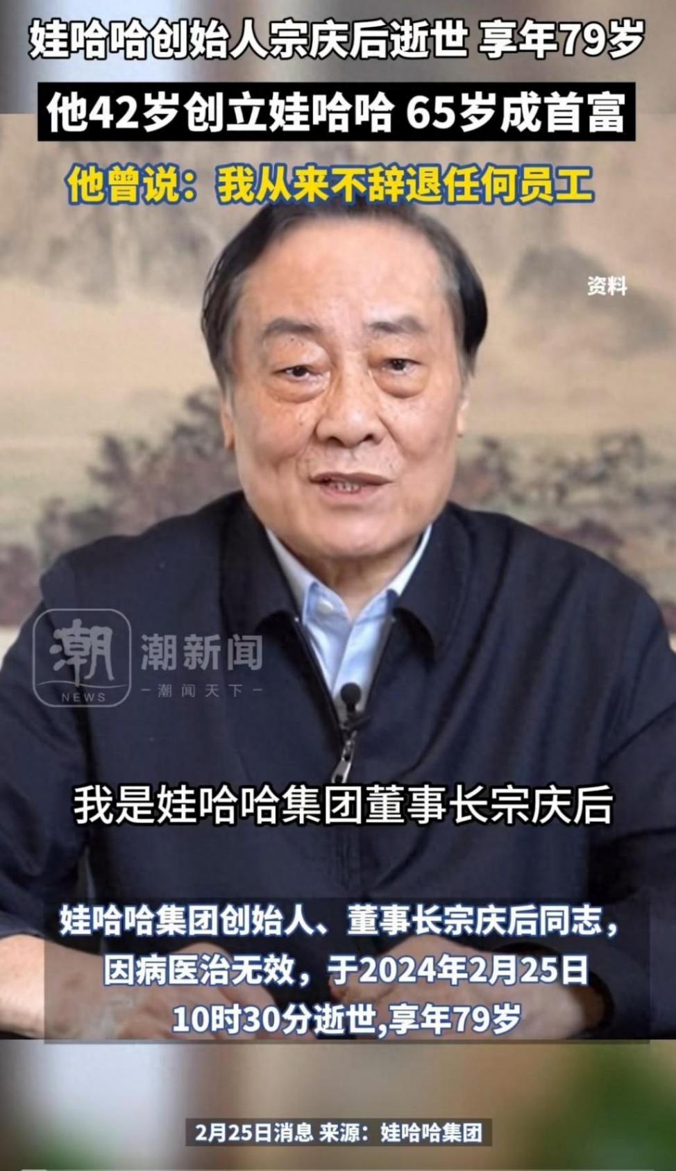 2月25日,娃哈哈集團創始人、董事長宗慶后逝世,享年79歲。
