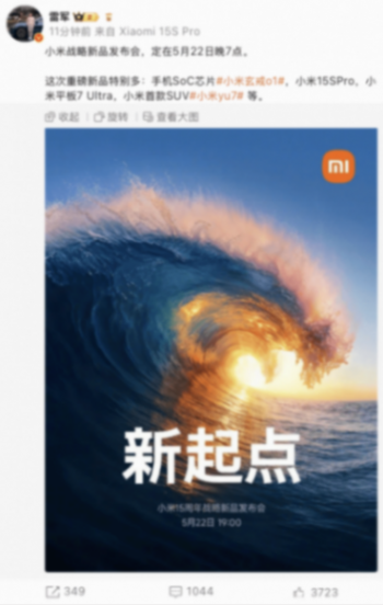 5月19日,小米創辦人、董事長兼CEO雷軍在微博發文稱,小米戰略新品發布會,定在5月22日晚7點。這次重磅新品特別多:手機SoC芯片#小米玄戒o1#,小米15SPro,小米平板7 Ultra,小米首款SUV#小米yu7# 等。