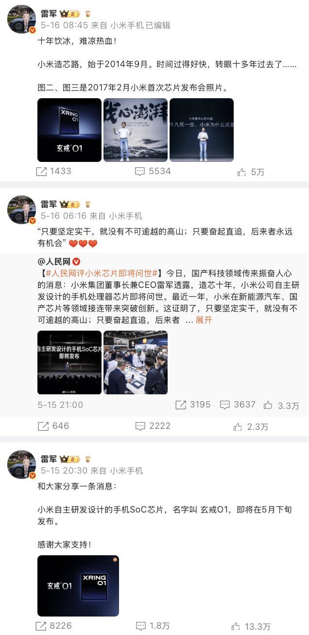 就在5月15-16日,雷軍曾在兩天內連發三條微博提及小米玄戒o1。他在相關博文中提及,小米造芯路,始于2014年9月。十年飲冰,難涼熱血!雷軍還表示,“只要堅定實干,就沒有不可逾越的高山;只要奮起直追,后來者永遠有機會” 。