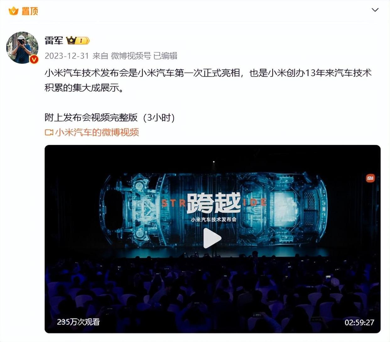 發(fā)布會(huì)后,雷軍多次在公開賬號(hào)發(fā)文宣傳小米汽車,其微博置頂內(nèi)容就是關(guān)于小米汽車發(fā)布會(huì)。