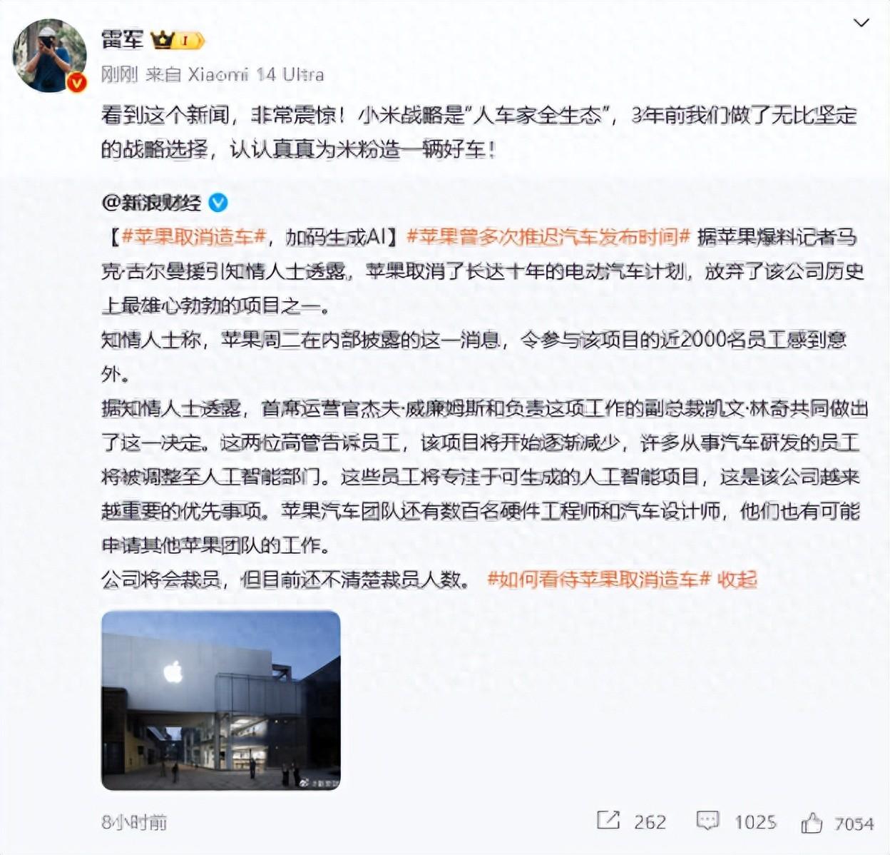 2月28日,雷軍轉(zhuǎn)發(fā)蘋果取消造車的新聞內(nèi)容,直呼“非常震驚”。