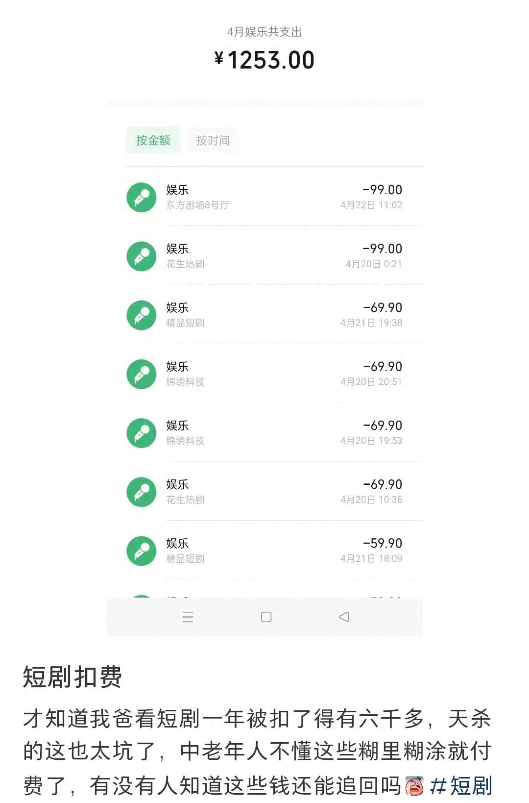 上到五六十歲的大爺大媽,下到十幾歲的高中生,都愛看短劇。一位網友曬出老父親的扣款賬單,因為不會操作手機,一年下來竟然因為刷短劇被扣款五六千塊錢,讓人啼笑皆非。