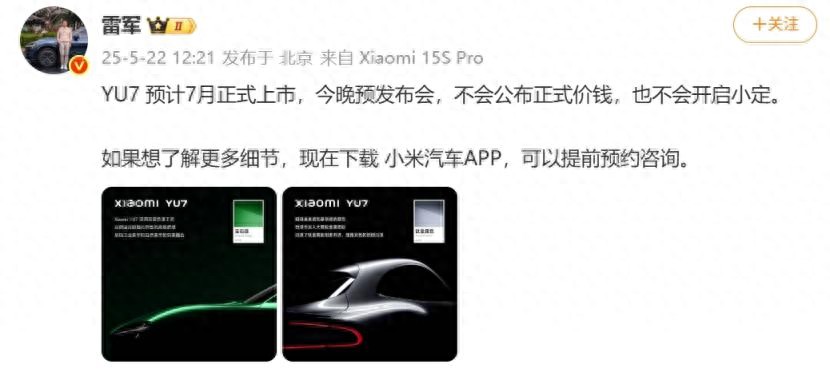 5月22日,雷軍發布微博表示,小米YU7 預計7月正式上市。今晚預發布會,不會公布正式價錢,也不會開啟小定。可通過小米汽車APP,了解更多細節,提前預約咨詢。 ???