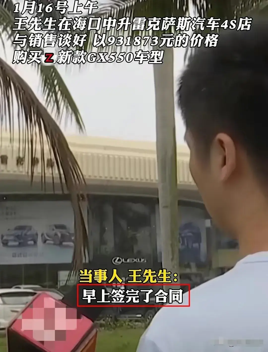 雷克薩斯以極低的故障率和高品質控制的特點,使它受到了多數人的青睞,海口的王先生就看中了雷克薩斯的一款車型,并且在1月份的時候,與4S店的銷售人員簽訂了購車意向合約,以931873元的價格購買Z新款的GX550車型,并且交了5萬塊錢的定金,還約定提車時間為5月10號前。