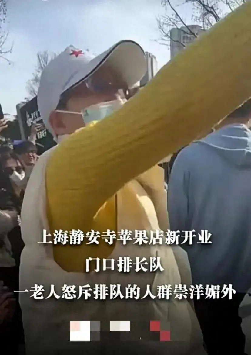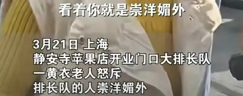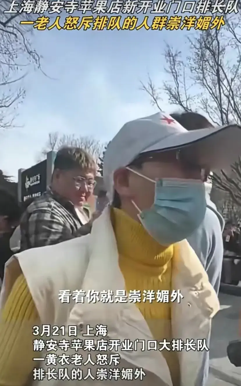 2021年8月的一個陽光明媚的周末,上海蘋果靜安店門口熙熙攘攘,人頭攢動。來自四面八方的果粉們排著長隊,翹首以盼地等待進入店內體驗新品。突然,一位滿頭白發、年約六旬的大媽出現在隊伍中,她一臉憤怒地指著這些年輕的果粉們破口大罵:“崇洋媚外!你們這些年輕人,為什么總是盲目追求外國品牌,而不支持我們自己的國產品牌?”